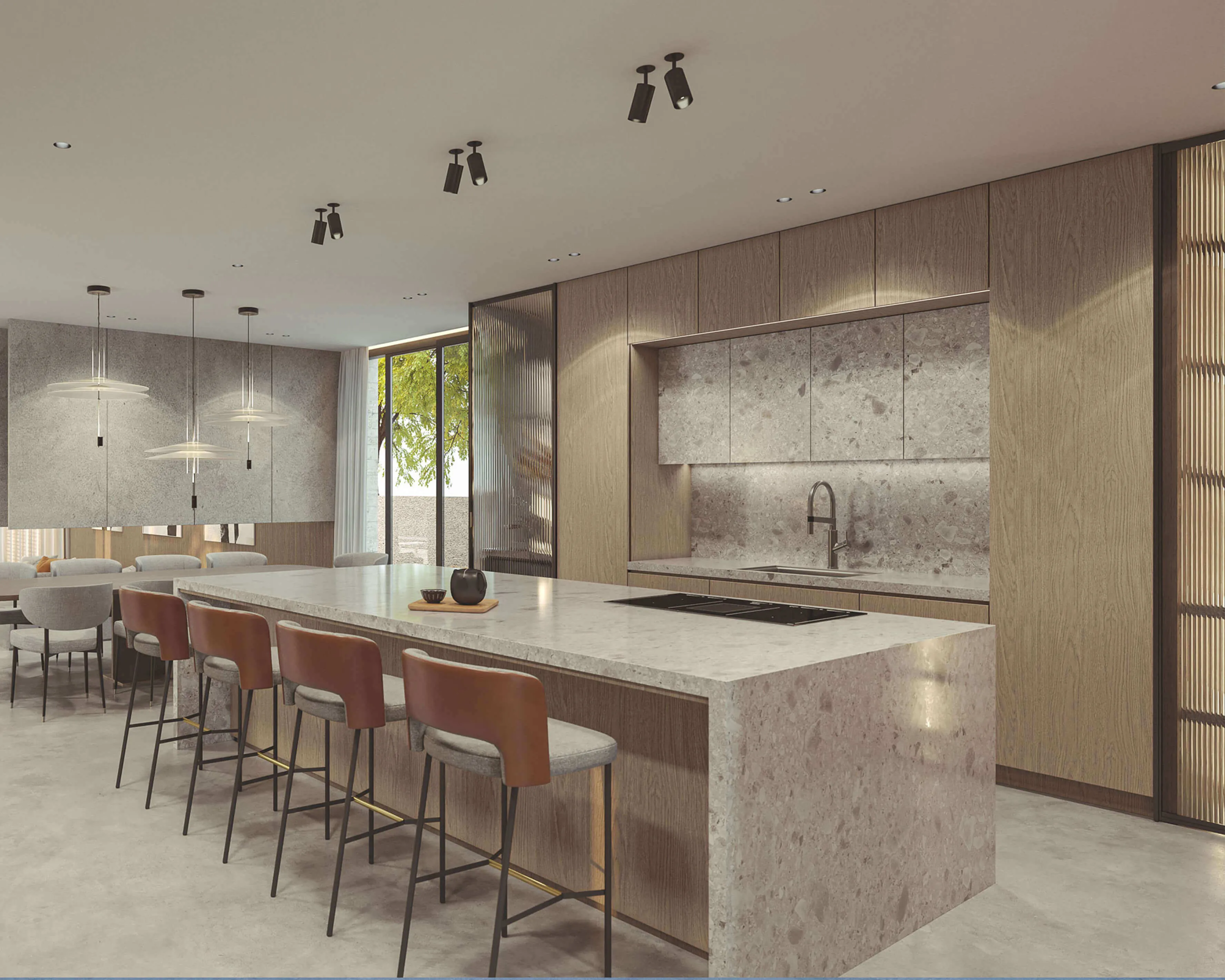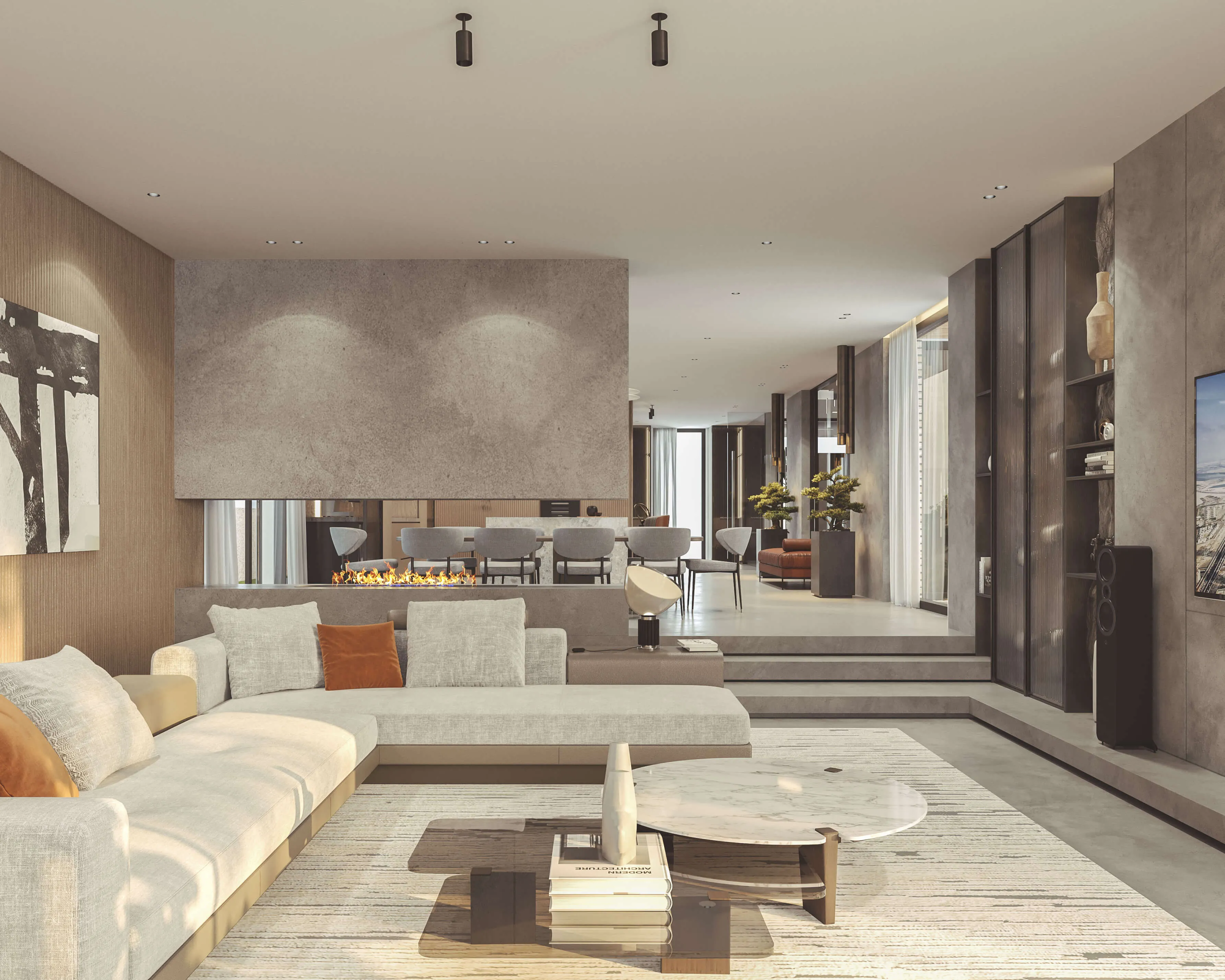 To balance the grand volume but preserve the intimacy of the home we opted for warm neutral materials with the use of different textures, which added visual interest and contrast to create this tranquil home