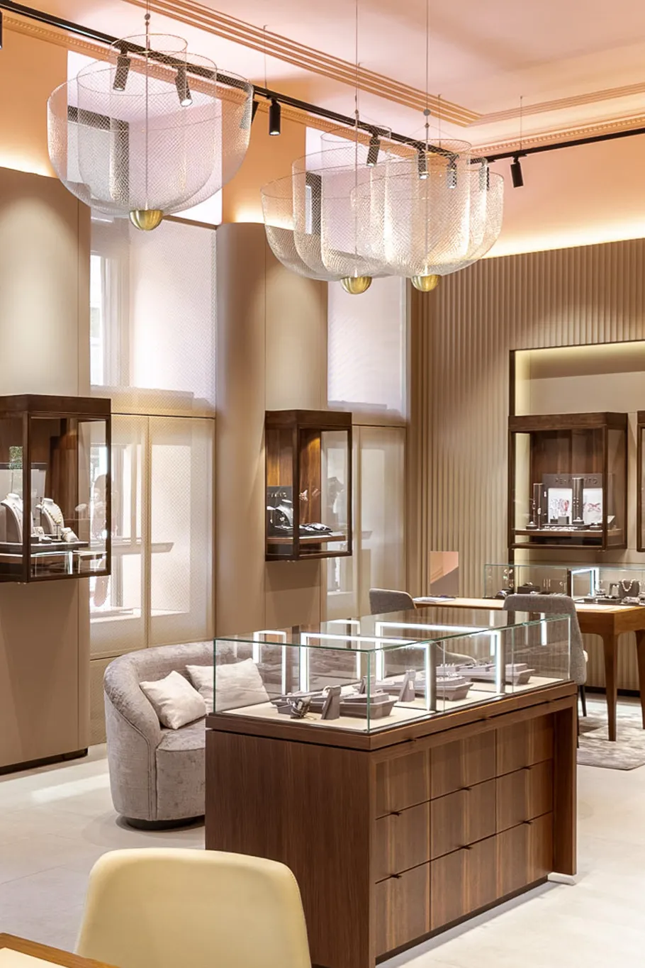 This jewelry shop design is all about texture and tactility. The flutted walls and perforations provide a contrast to the smooth, shiny jewelry , while t he monochromatic color scheme creates a sleek and modern look . The display cases are simple and elegant, allowing the jewelry to take center stage.